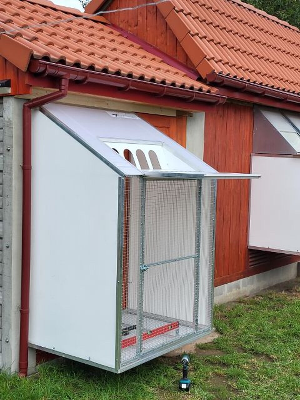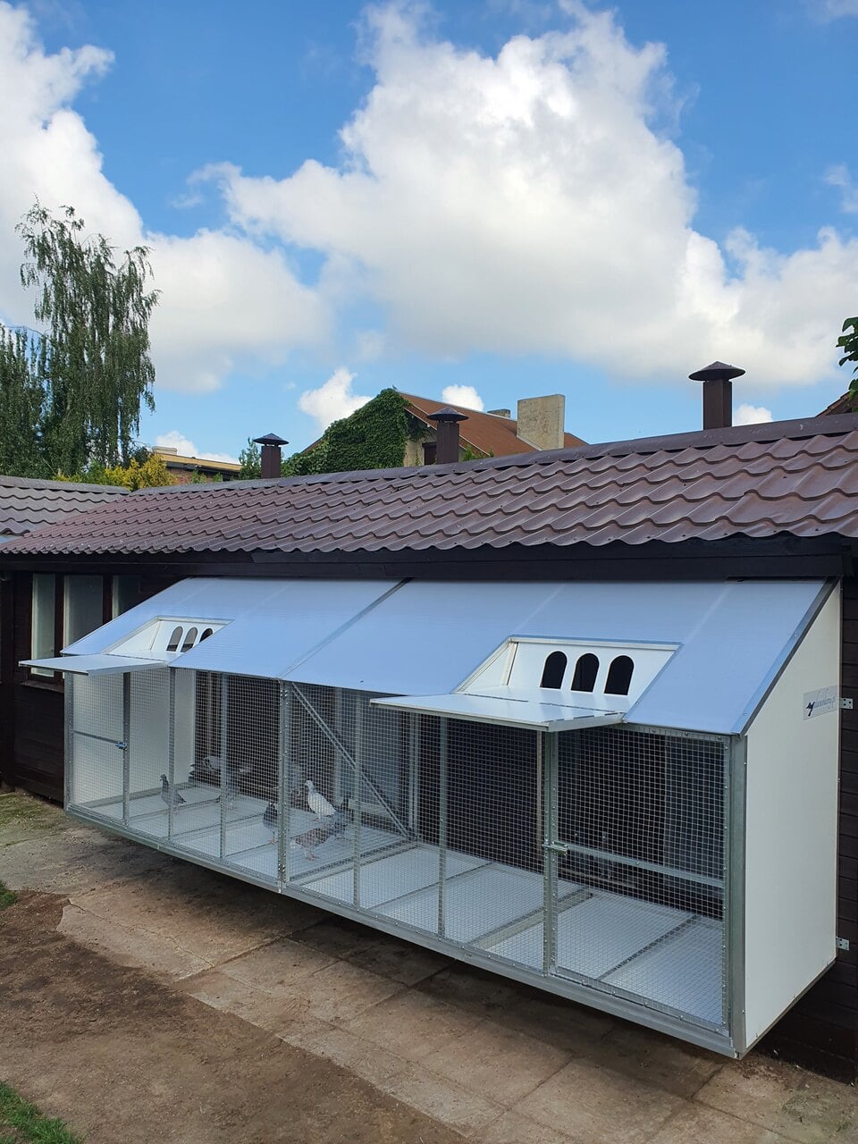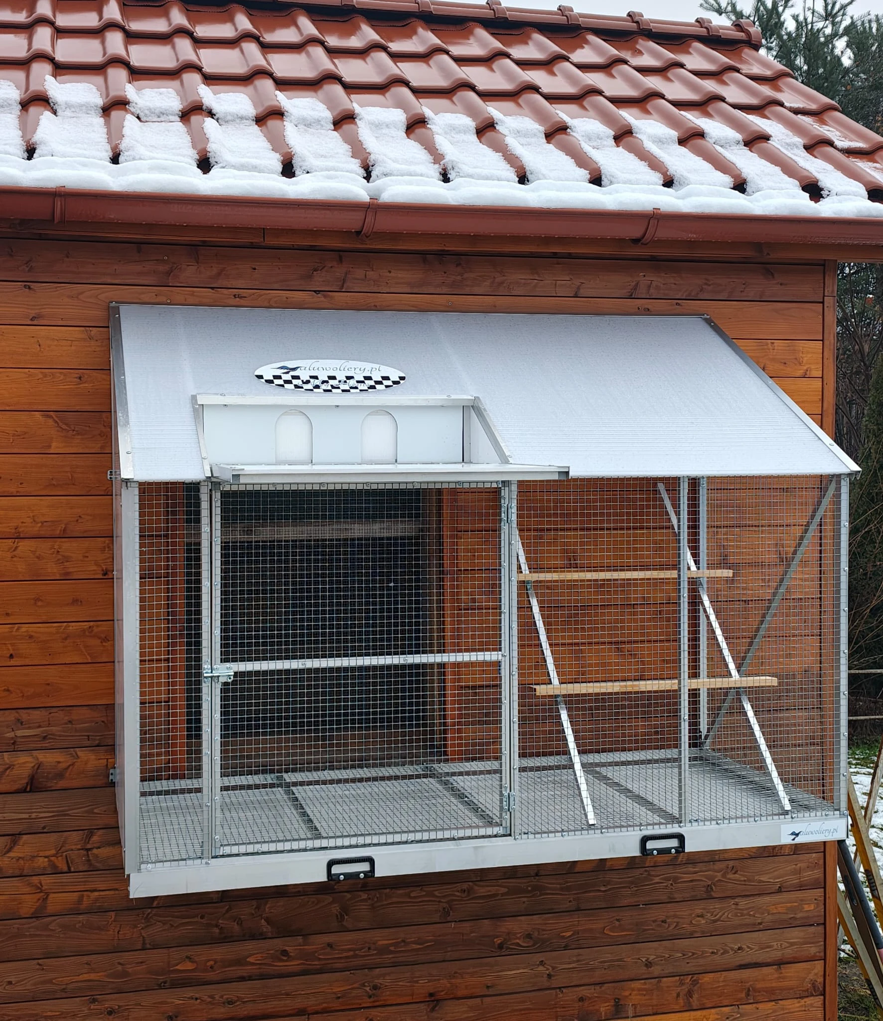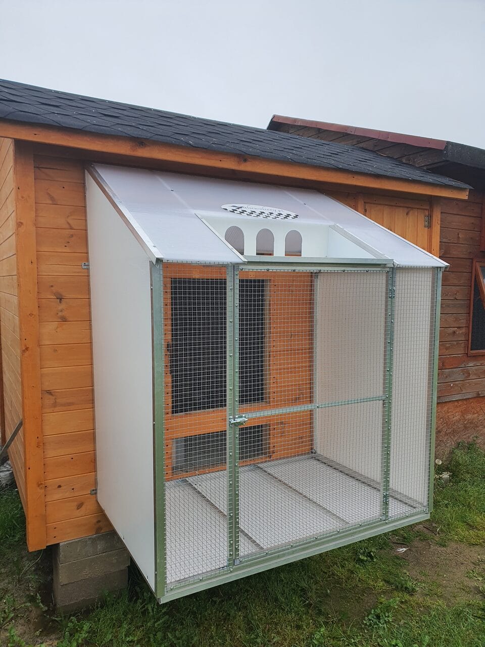 Woliery aluminiowe 2w1 to nowoczesne, elegancko wyglądające produkty premium montowane do ścian frontowych waszych gołębników. To połączenie zadaszonej pod skosem woliery w który profesjonalnie wmontowano wlot do gołębnika.