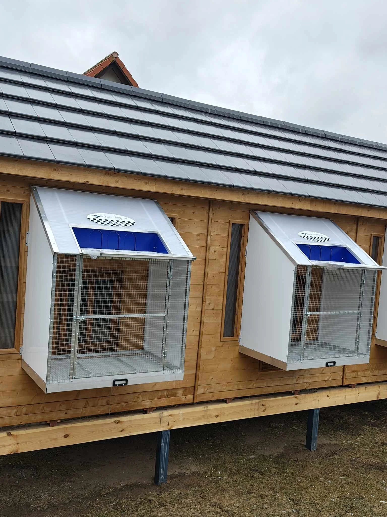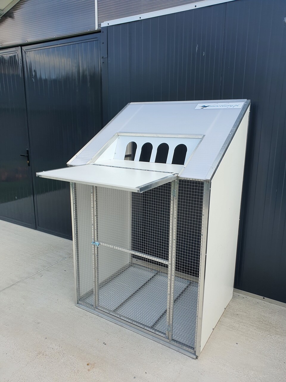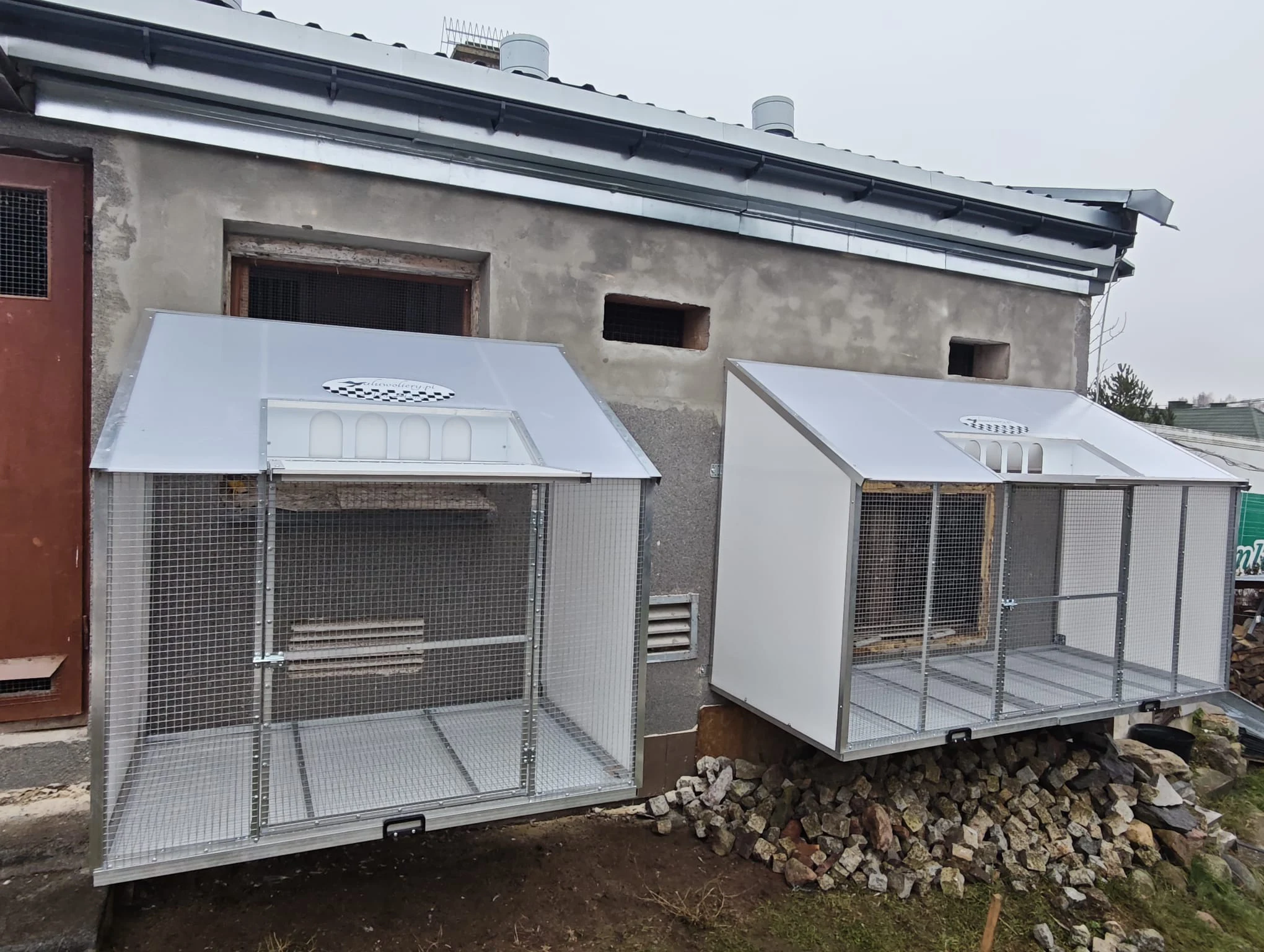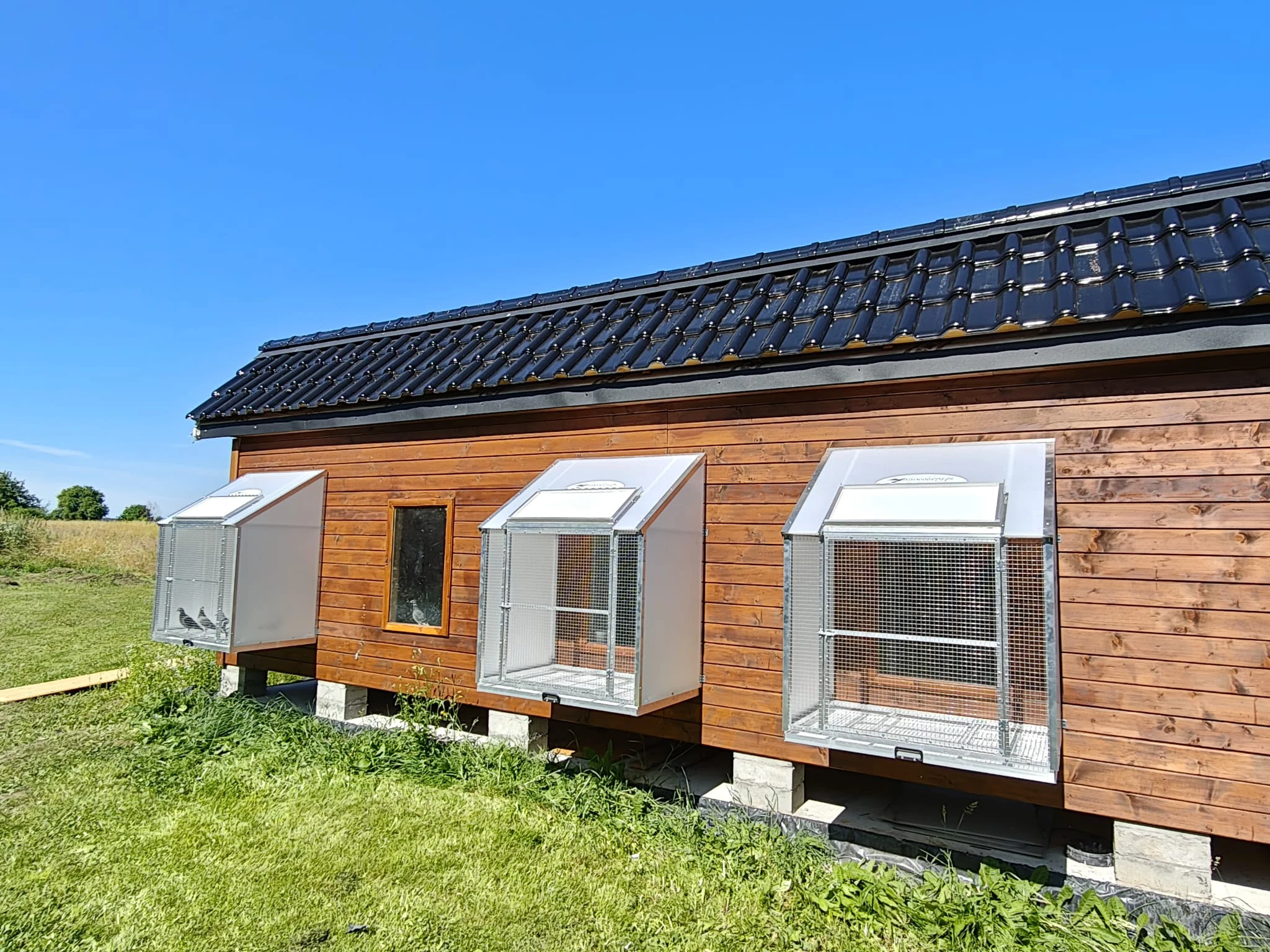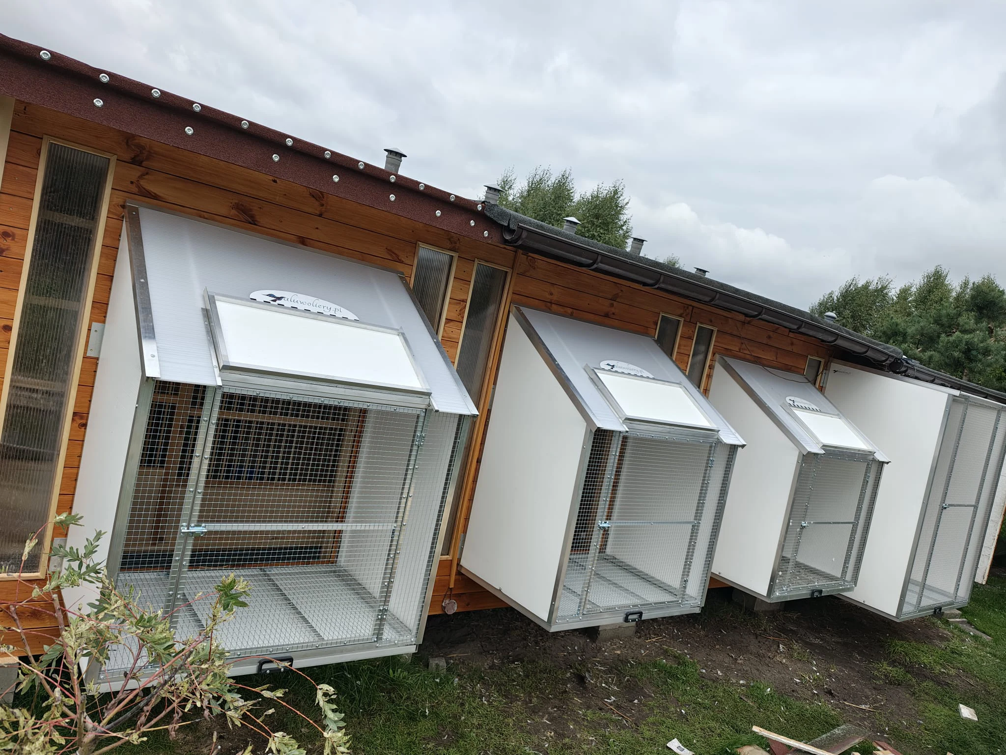 Woliery aluminiowe 2w1 to nowoczesne, elegancko wyglądające produkty premium montowane do ścian frontowych waszych gołębników. To połączenie zadaszonej pod skosem woliery w który profesjonalnie wmontowano wlot do gołębnika.