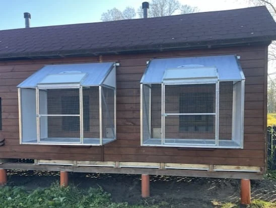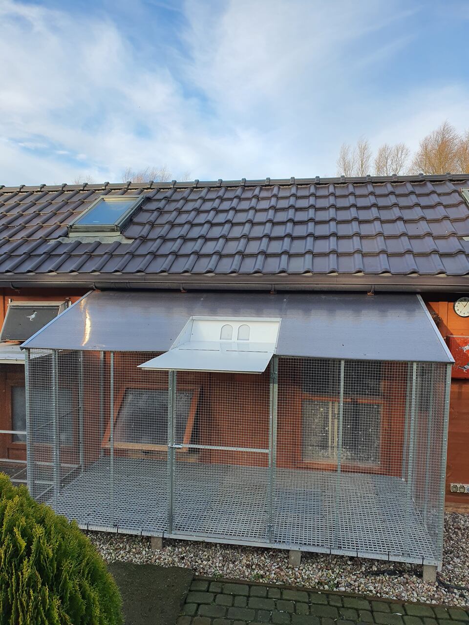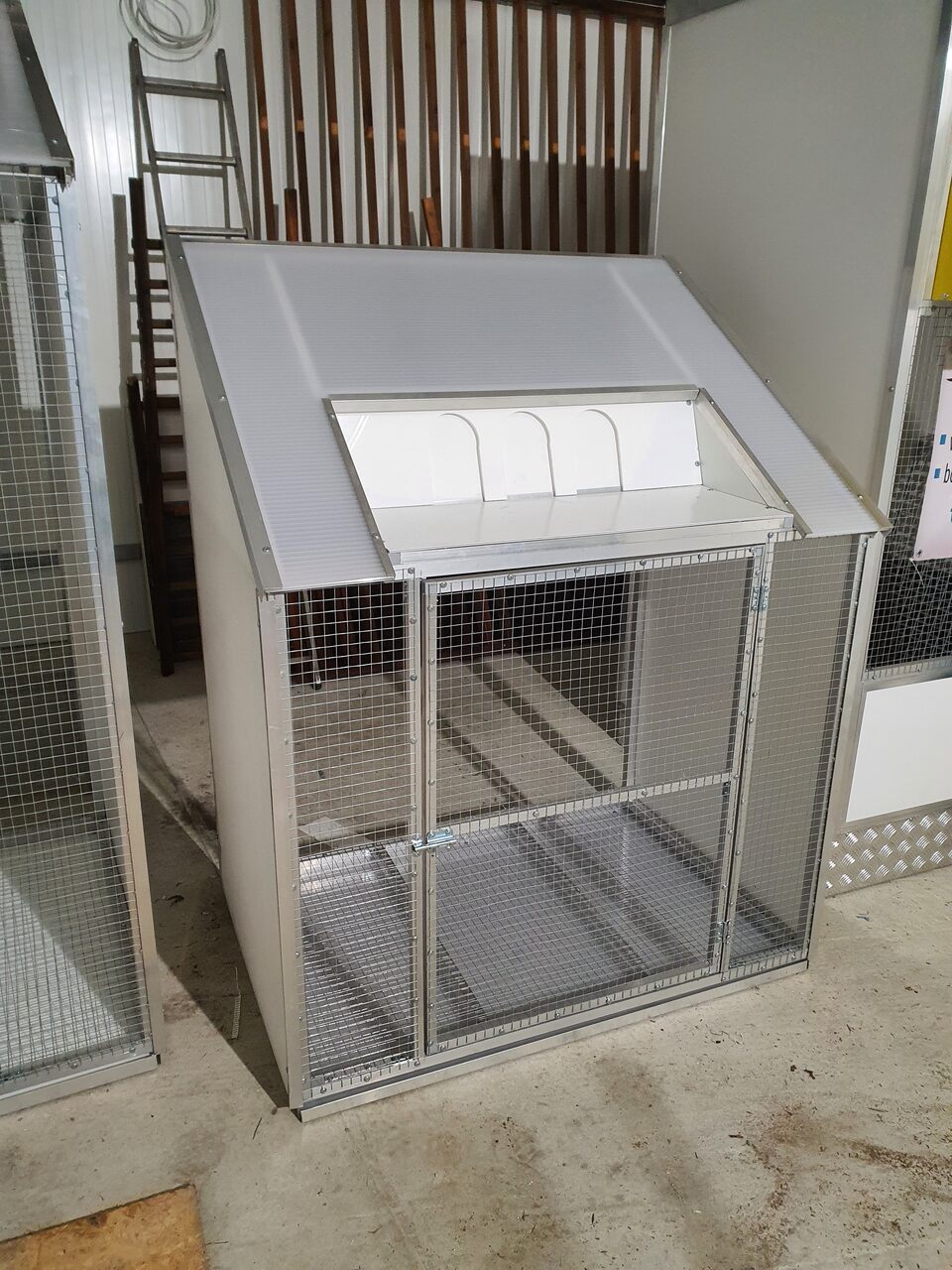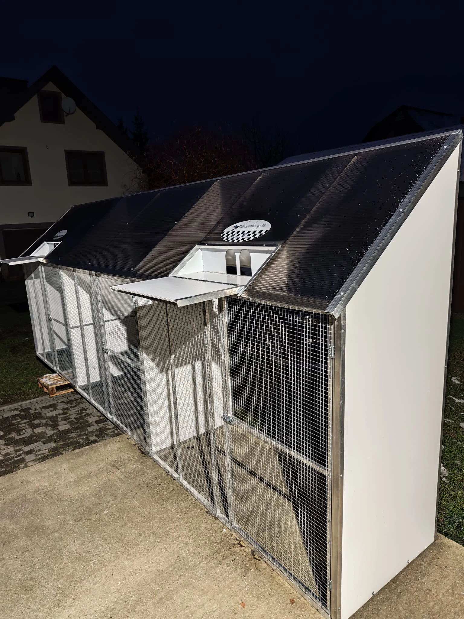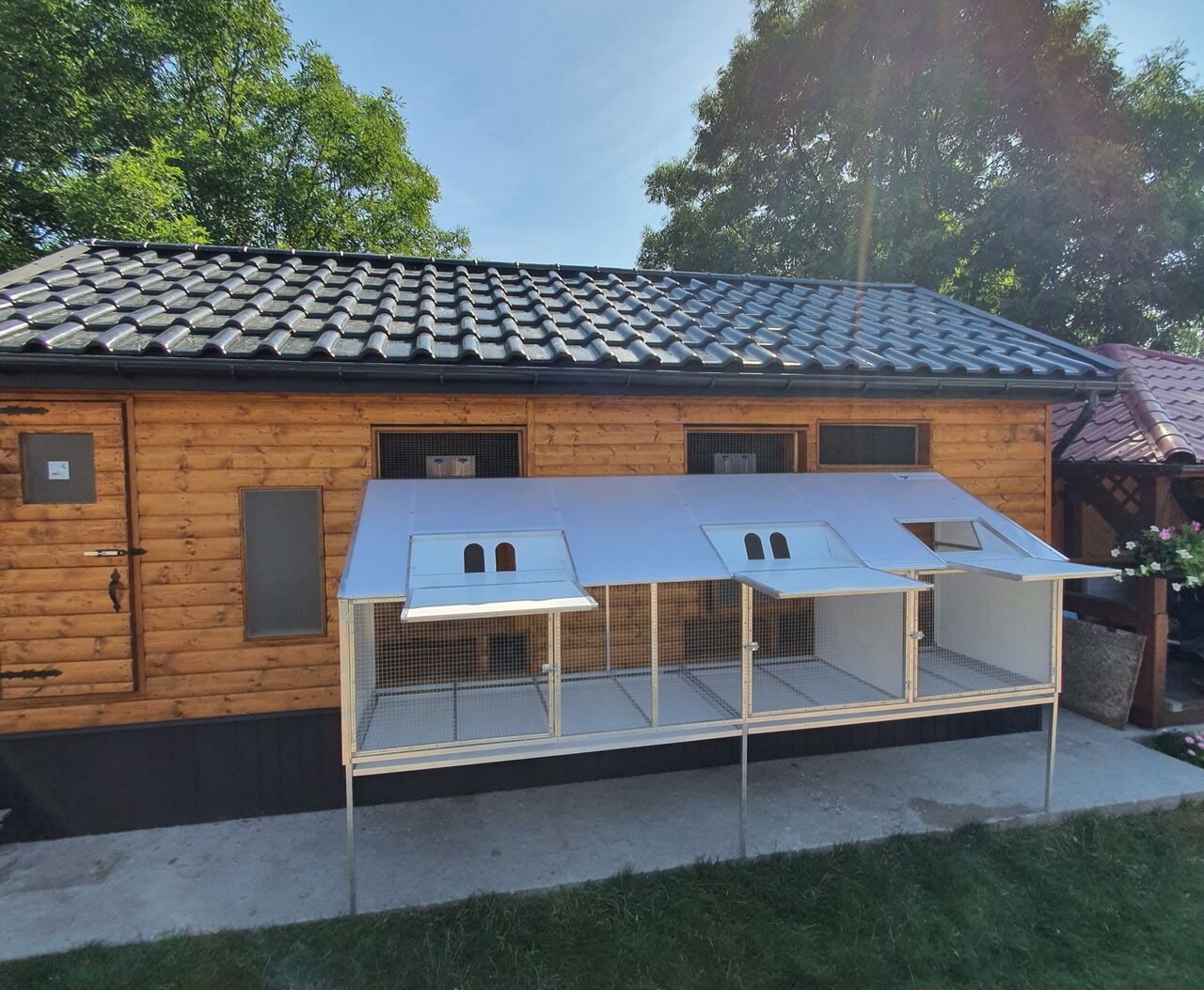 Woliery aluminiowe 2w1 to nowoczesne, elegancko wyglądające produkty premium montowane do ścian frontowych waszych gołębników. To połączenie zadaszonej pod skosem woliery w który profesjonalnie wmontowano wlot do gołębnika.